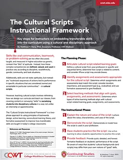In 2018, Associate Professor of Adult & Higher Education Matthew Hora developed a 7-week online faculty development course that led faculty through the history of the skills discourse and problems with generic notions of how skills like communication, critical thinking, and self-regulated learning are deeply shaped by the professions, race/ethnicity, and gender. Participants were introduced to the “Skills as Cultural Scripts” approach to embedding these skills into course syllabi, lesson plans, or even in campus-wide strategic plans in a way that models sociocultural and equity-centered theories of learning.
