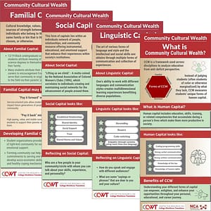 Historically, research and programming involving undergraduates of color focused on what these students lack – an approach that not only demotivates students, but also misses opportunities to support them as they build upon their existing strengths. Community Cultural Wealth (CCW) is a framework focusing on students’ assets, including skills and dispositions from their families, communities of origin, cultures, and personal experiences. For example, familial capital refers to cultural knowledge nurtured within families or fictive kin, and resistant capital is knowledge created through challenging inequality and resisting subordination.