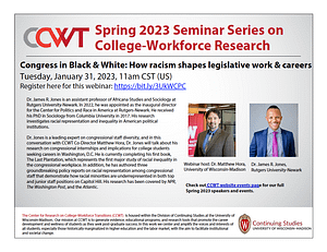 Dr. Jones is a leading expert on congressional staff diversity, and in this conversation with CCWT Co-Director Matthew Hora on January 31, 2023, Dr. Jones will talk about his research on congressional internships and implications for college students seeking careers in Washington, D.C.