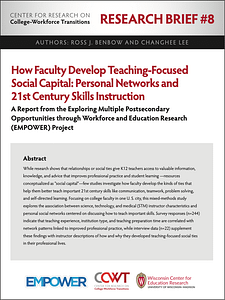 Abstract: While research shows that relationships or social ties give K12 teachers access to valuable information, knowledge, and advice that improves professional practice and student learning —resources conceptualized as “social capital”—few studies investigate how faculty develop the kinds of ties that help them better teach important 21st century skills like communication, teamwork, problem solving, and self-directed learning. Focusing on college faculty in one U. S. city, this mixed-methods study explores the association between science, technology, and medical (STM) instructor characteristics and personal social networks centered on discussing how to teach important skills. Survey responses (n=244) indicate that teaching experience, institution type, and teaching preparation time are correlated with network patterns linked to improved professional practice, while interview data (n=22) supplement these findings with instructor descriptions of how and why they developed teaching-focused social ties in their professional lives.