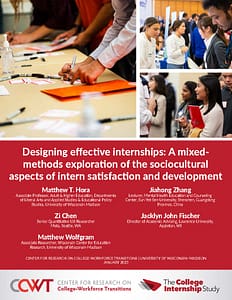 Hora M.T., Thompson M., Jang-Tucci K., Pasqualone A., Akram-Turenne T., Wolfgram M., Lee C. (2023). What are the longitudinal impacts of a college internship (during a pandemic)? Findings from the College Internship Study on program participation, quality, equitable access, and student outcomes. Center for Research on College-Workforce Transitions. University of Wisconsin–Madison, Division of Continuing Studies.