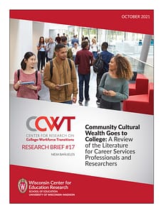 Abstract: Created by LatCrit scholars in the mid-2000s, Community Cultural Wealth (CCW) is an anti-deficit framework for understanding educational inequality. Since its publication, Yosso’s (2005) seminal paper on the topic has been cited thousands of times by scholars in fields as distinct as engineering, K12 education, and public health. This report reviews the recent scholarship on college students’ experiences and outcomes that uses CCW as a guiding framework. Although the intended audience for this review is career services professionals in colleges and universities, my hope is it can also be helpful for scholars of career development who want to brush up on the CCW literature and consider future research questions the framework presents. The existing literature offers insights on the college-to-career transition: it reveals the centrality of familial capital in shaping students’ career pathways, the function of resistant capital in forming students’ career interests, the utility of students’ existing social capital in the job search process, and the role of counterspaces in activating CCW for career success. However, CCW scholarship typically focuses on college students’ matriculation, persistence, sources of support, and well-being, not on their career development—including the psychological, spiritual, sociocultural, political and economic factors influencing students’ career interests and the knowledge, relationships, and environmental contexts shaping their career choices (Duffy & Dik, 2009). This gap presents opportunities for researchers and career services professionals to partner in creating and evaluating programming with CCW in mind. There are also opportunities to increase the methodological diversity of CCW scholarship, to consider the ways in which students mix CCW with “dominant” forms of capital for career success, to collect data from employers, faculty, and other gatekeepers, and to account for the role of institutional context.