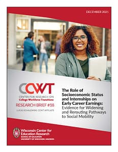 Abstract: The research brief first summarizes findings on internships, a university structure, pulled from a study that more broadly examined how student engagement and high-impact practices relate to post-graduation outcomes among students from different SES backgrounds (Schalewski, 2020). First, results suggest internships have a mediating role between a student’s (SES) and early career earnings. Next, results show students from middle-SES backgrounds or those within quartiles two and three experience a significant effect from internship participation on early career earnings with non-significant findings for the lowest and highest quartiles. The brief concludes with implications for practice that aim to widen and reroute pathways to internships for lower- SES students to increase opportunities that lead to higher early career salaries and set trajectories for social mobility.