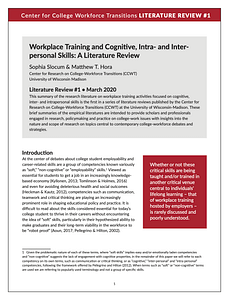 This summary of the research literature on workplace training activities focused on cognitive, inter- and intrapersonal skills is the first in a series of literature reviews published by the Center for Research on College-Workforce Transitions (CCWT) at the University of Wisconsin-Madison. These brief summaries of the empirical literatures are intended to provide scholars and professionals engaged in research, policymaking and practice on college-work issues with insights into the nature and scope of research on topics central to contemporary college-workforce debates and strategies.